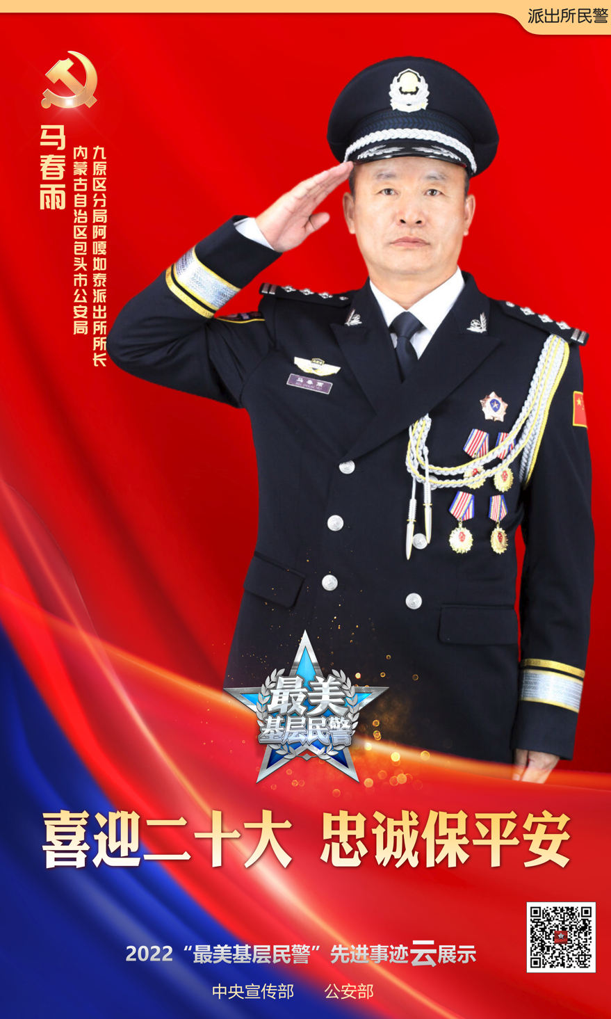 马春雨,1969年出生,内蒙古自治区包头市公安局九原区分局阿嘎如泰派出所所长。从警22年来,他始终扎根基层一线,被评为内蒙古自治区优秀人民警察、“感动北疆·最美警察”等,荣立个人三等功7次。