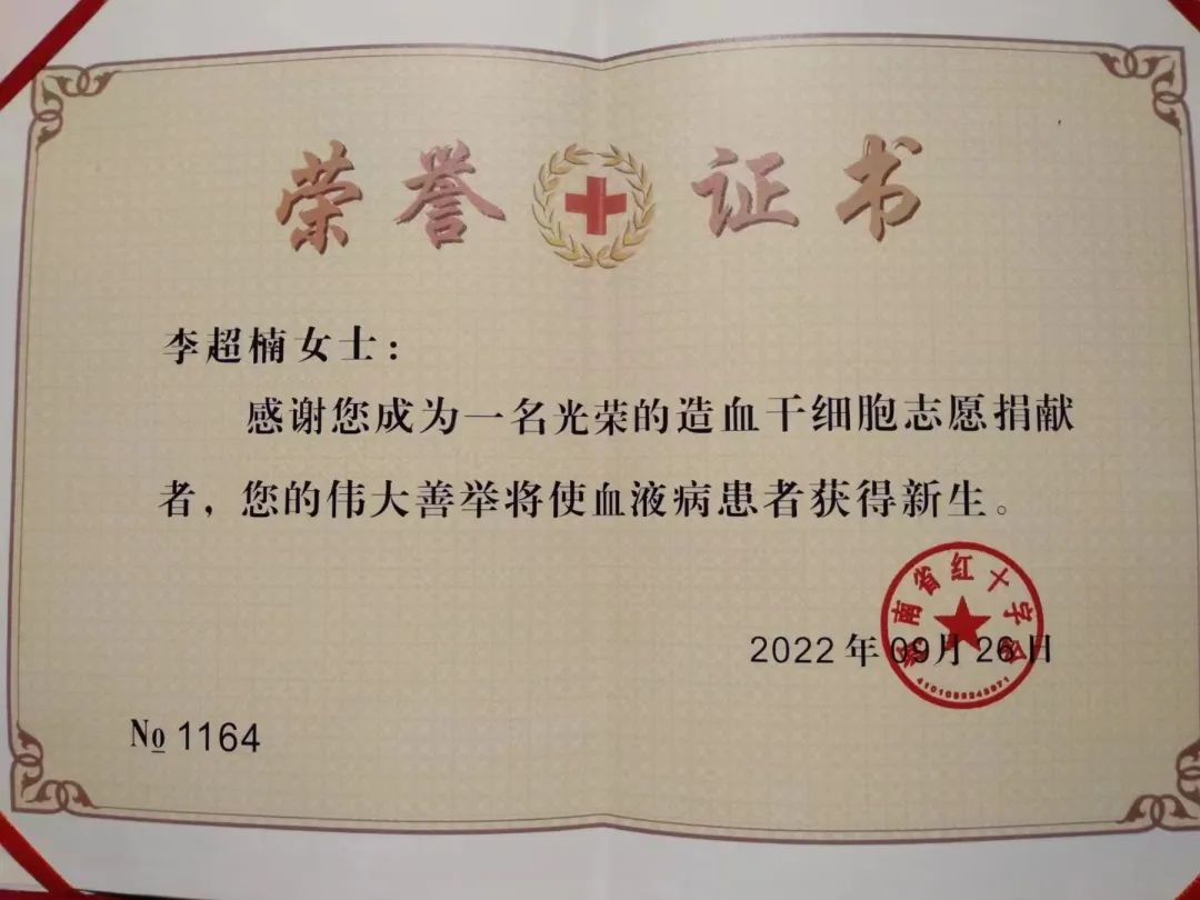 2017年8月24日,李超楠顺利加入了中国造血干细胞捐献者资料库,2022年7月份经中华骨髓库检索,与一名血液病患者HLA分型结合。当得知这个结果后,李超楠积极配合后续检查,当最终确定自己符合捐献造血干细胞条件后,她激动中夹杂着一丝丝紧张,激动的是可以帮助一名18岁的少年重获健康,但紧张也随之而来。直到此刻,她才终于决定将这件事告诉了她的丈夫,一名军人……