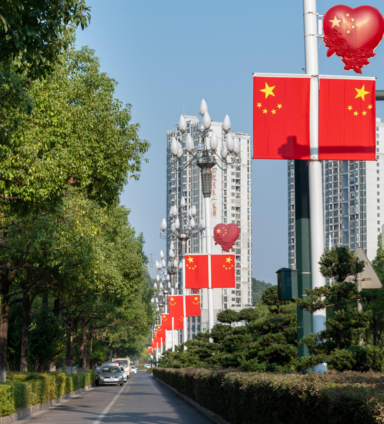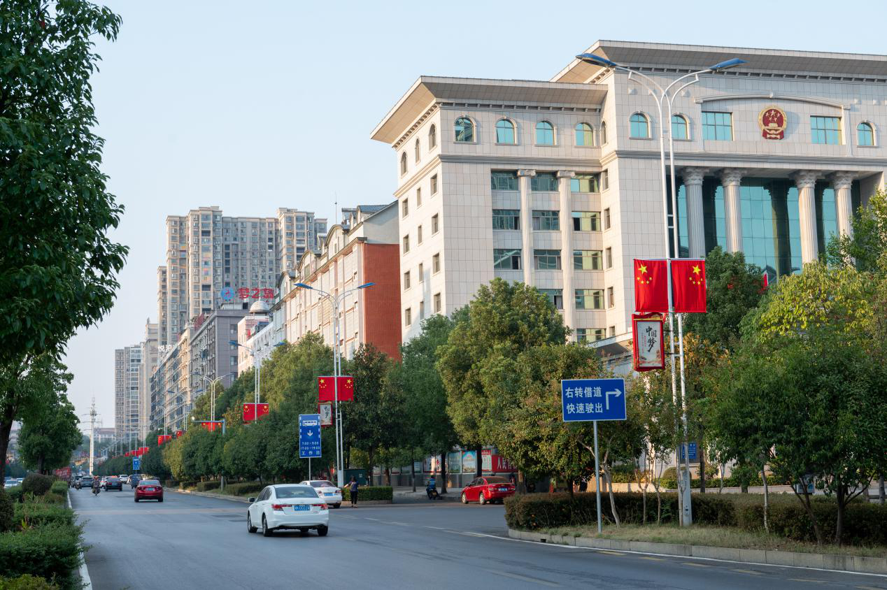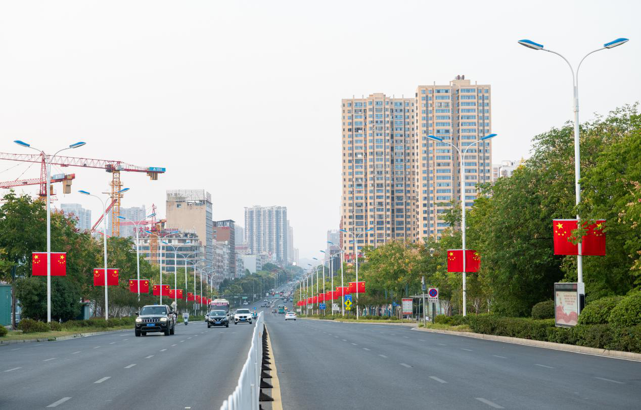 “国庆”期间,中心城区主要街道抬头可见悬挂的五星红旗,鲜艳的五星红旗与绿色的街道景致相互衬托,将成为城区一道靓丽的风景线,把城市映衬得更加美丽。(王友专 邹强)