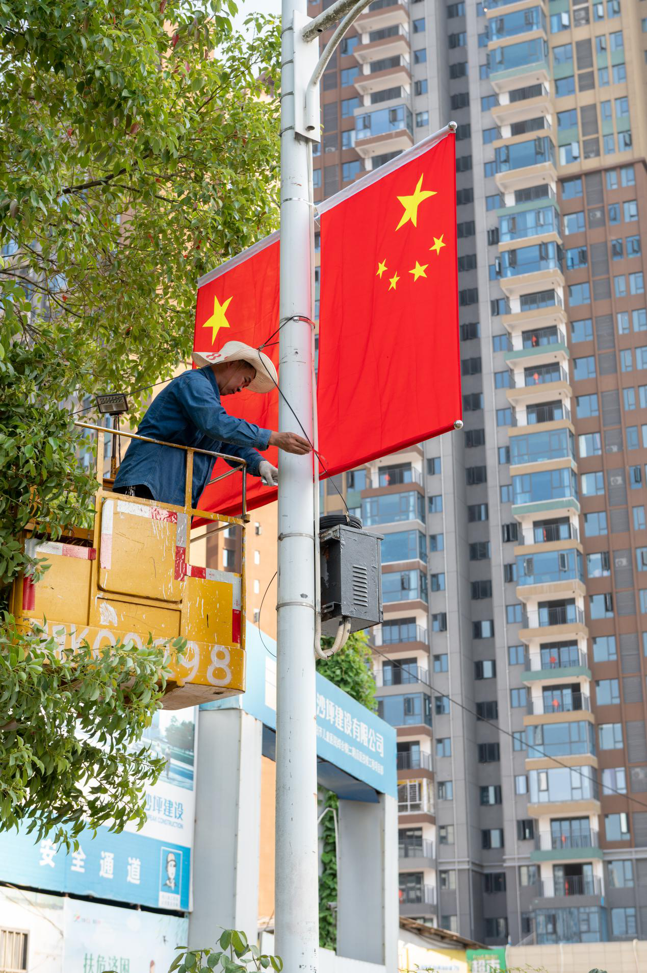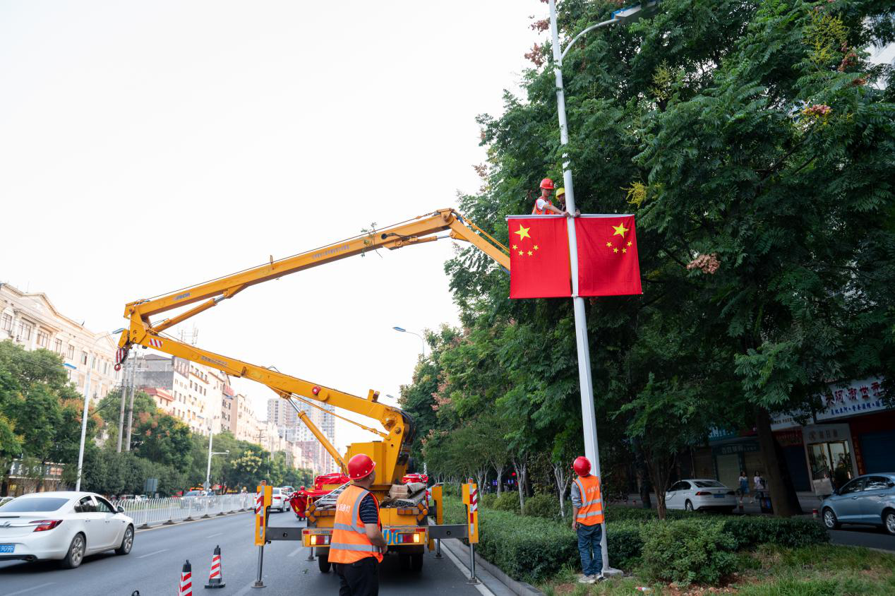 9月28日,市民朋友从湘中大道、吉星路、娄星南路等街道路过时,可以看到娄底市城市照明服务中心的工作人员正在紧张工作,给街道两旁的路灯灯杆上悬挂规格统一、色彩鲜艳的五星红旗。