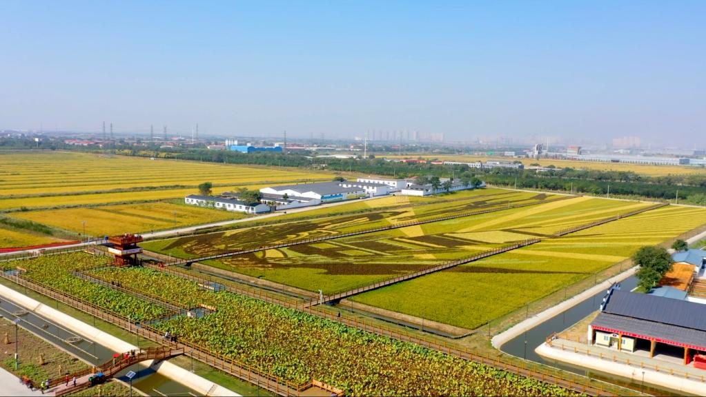 从瞭望塔俯瞰,一侧是稻浪翻滚、满目金黄的小站稻会馆村种植核心区;另一侧,一幅由五种彩色稻谷种植而成的巨型稻田画徐徐铺展,开阔而壮丽。