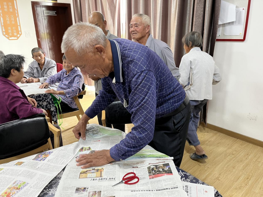 工作人员提前收集了塑料袋、报纸,丝带等环保材料,通过PPT展示成品并讲解了制作方法。老人们经过裁剪、粘贴、捆绑,把一张张废旧的报纸变成一件件精美的衣服和手工包。他们围坐在一起认真琢磨,相互帮助,有的做帽子,有得做围裙,还有的做裙子,每个人都沉浸在自己的“设计”中。