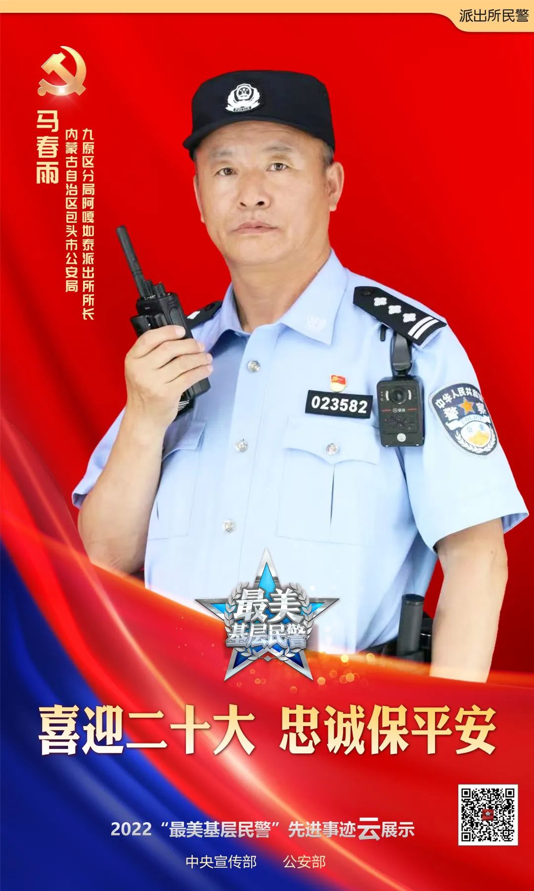 马春雨,1969年出生,内蒙古自治区包头市公安局九原区分局阿嘎如泰派出所所长。从警22年来,他始终扎根基层一线,先后被评为内蒙古自治区优秀人民警察、“感动北疆·最美警察”,荣立个人三等功7次,2022年被评选为全国“最美基层民警”。