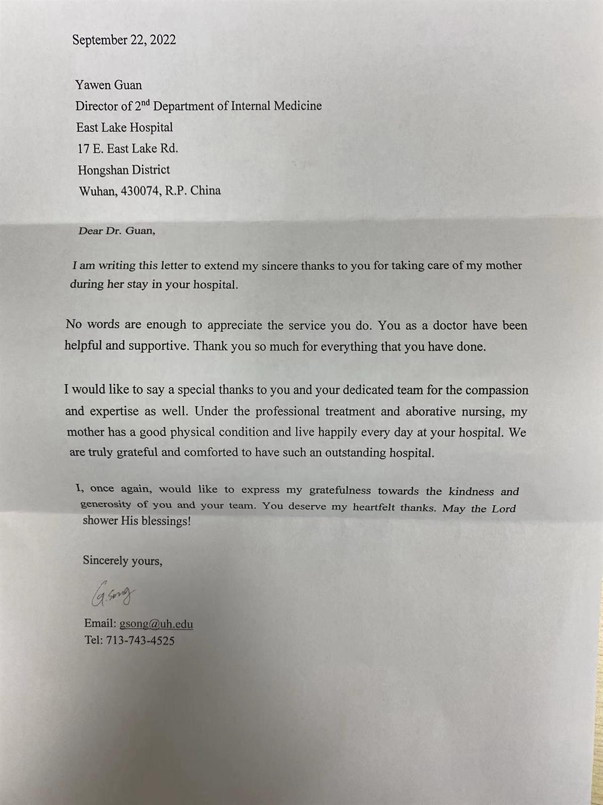 现在葛婆婆与宋先生视频时,总是对医护人员赞不绝口。暂时无法回国探视的宋先生看到自己的母亲身体越来越硬朗,觉得安心多了,对医护人员心生感激。于是,从美国托人将感谢信与锦旗送到东湖医院内二科,以表达自己的谢意。