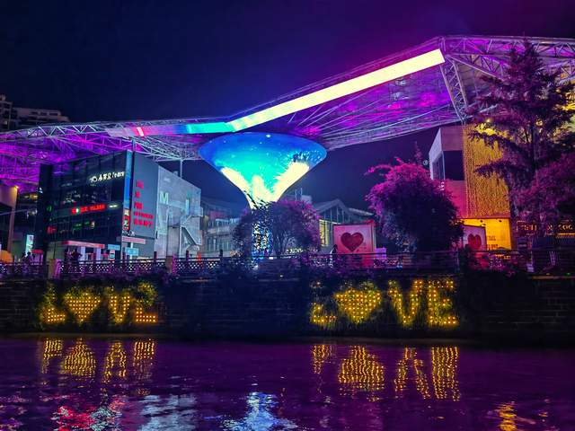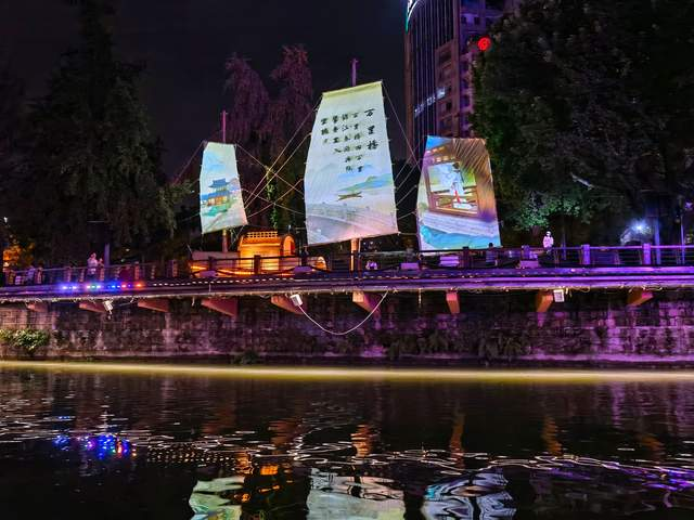 自古以来,桨声灯影夜航船就是兼具诗情画意与风流气质的夜游活动,成都文旅依托锦江两岸的建筑立面透明屏、叠水景观屏、堤岸投影,打造了科技感十足的多维空间场景秀,以河堤为画布,配合跌宕起伏的音乐效果和婀娜多姿的汉服表演,将游客拉入梦幻绚丽的千年画卷之中,去身临其境地感受千年之前锦江商贸的盛景。