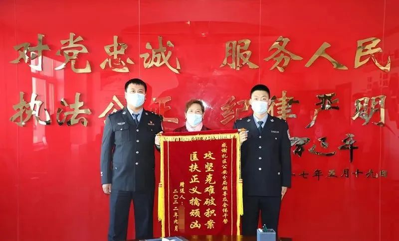 2022年9月26日,被害人宫某某家属来到呼伦贝尔满洲里市公安局扎赉诺尔区分局,将印有“攻坚克难破积案、匡扶正义擒顽凶”的锦旗送到办案民警手中,感谢扎赉诺尔公安用正义还逝者以公道、证法律之尊严。
