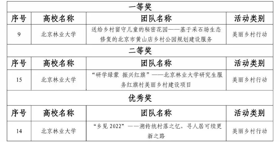 近日,北京市委教育工委公布了首都高校师生服务“乡村振兴”行动计划成果获奖名单,共评选一等奖10项、二等奖20项、三等奖30项、优秀奖38项。北京林业大学三支团队分别获得一等奖、二等奖和优秀奖。