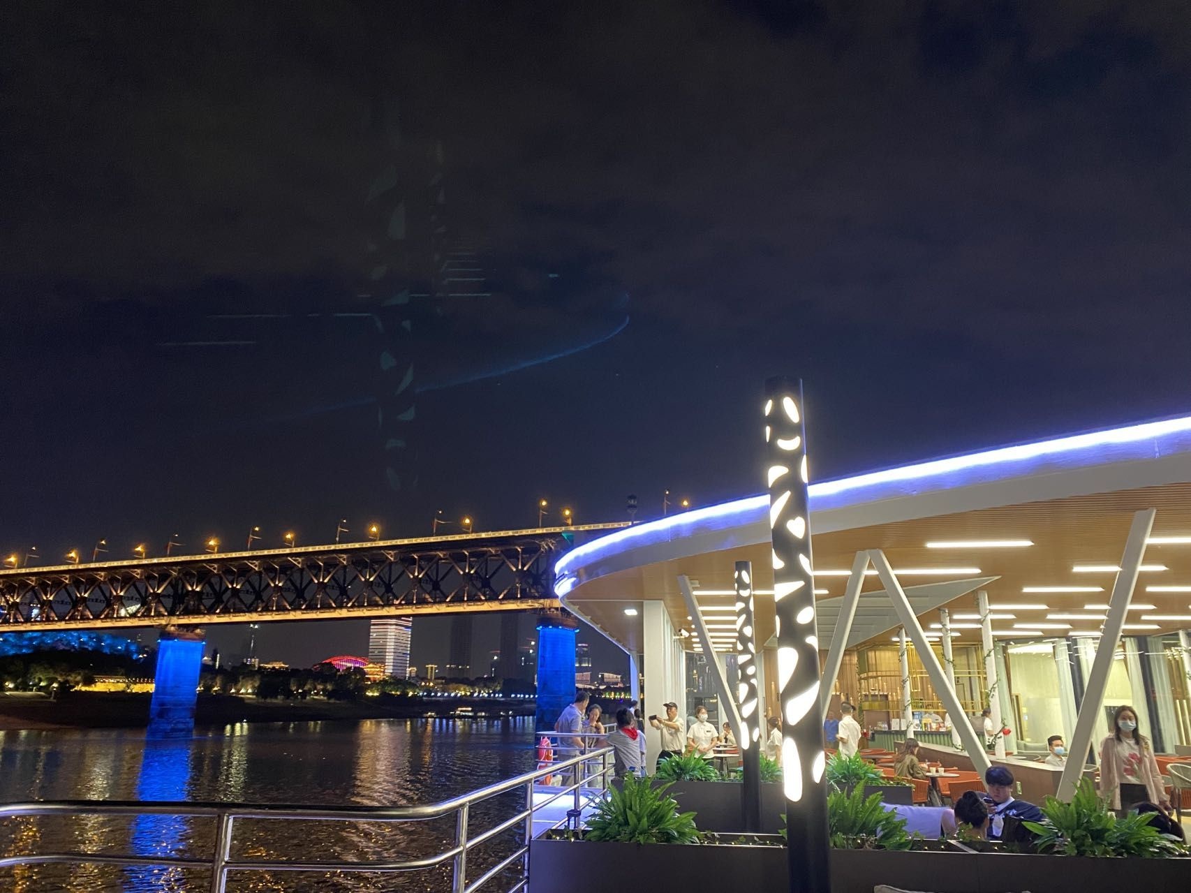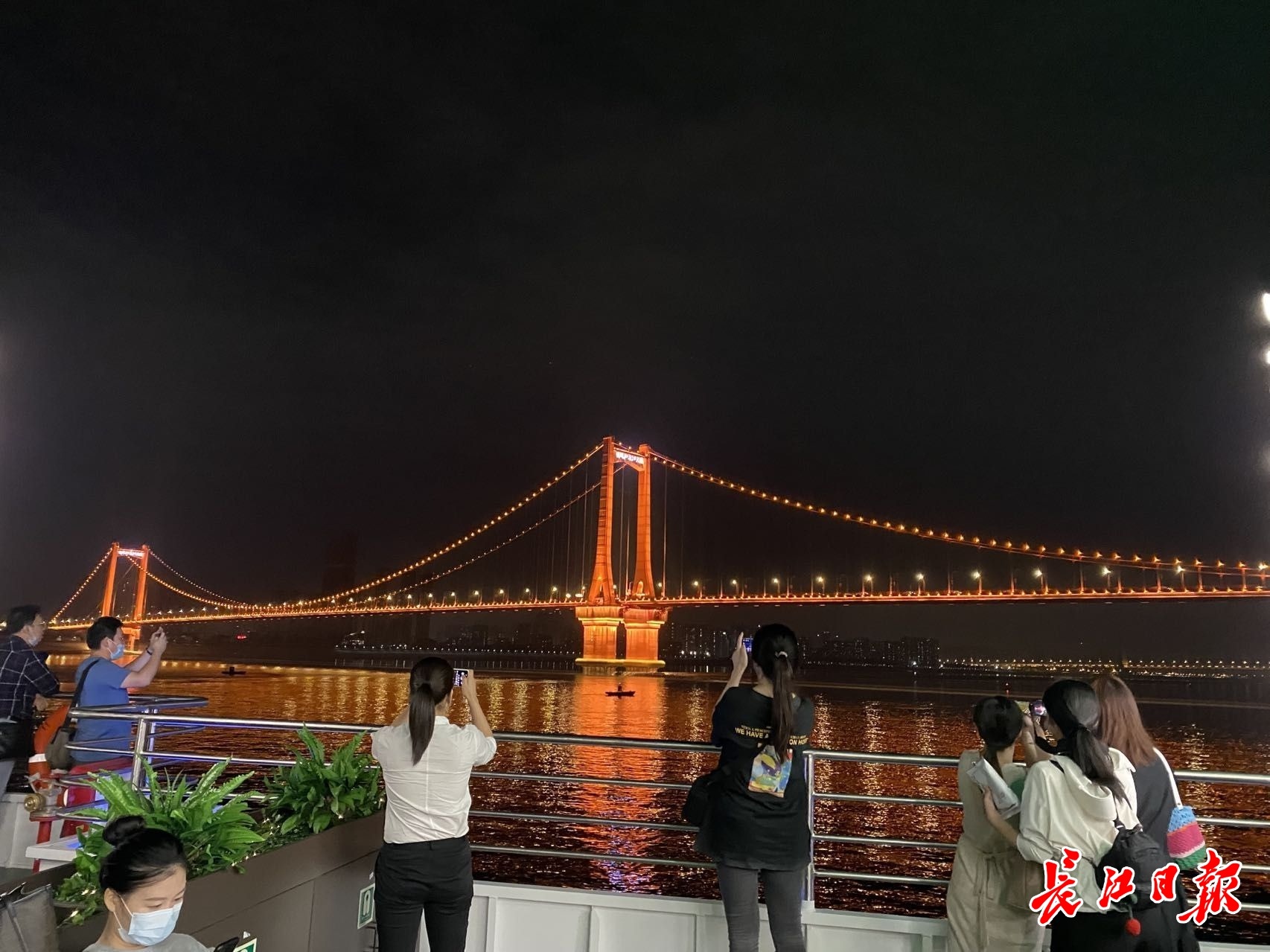 当晚,游客出示健康码、测量体温后有序登船。20时许,游船缓缓离开码头,穿过武汉长江大桥,往鹦鹉洲长江大桥方向驶去。航行中的“两江晴川”号,船身变幻出不同的色彩,如同一颗耀眼的“明珠”。沿途经过的黄鹤楼、龟山电视塔、晴川桥等景点、建筑,在夜色下熠熠生辉、流光溢彩。在经过武汉长江大桥时,雄伟壮观的景致和游轮交相辉映,引得许多市民游客纷纷与之同框拍照打卡。可在船上欣赏到全貌的橙红色鹦鹉洲大桥更成为不少游客照片中的“主角”。