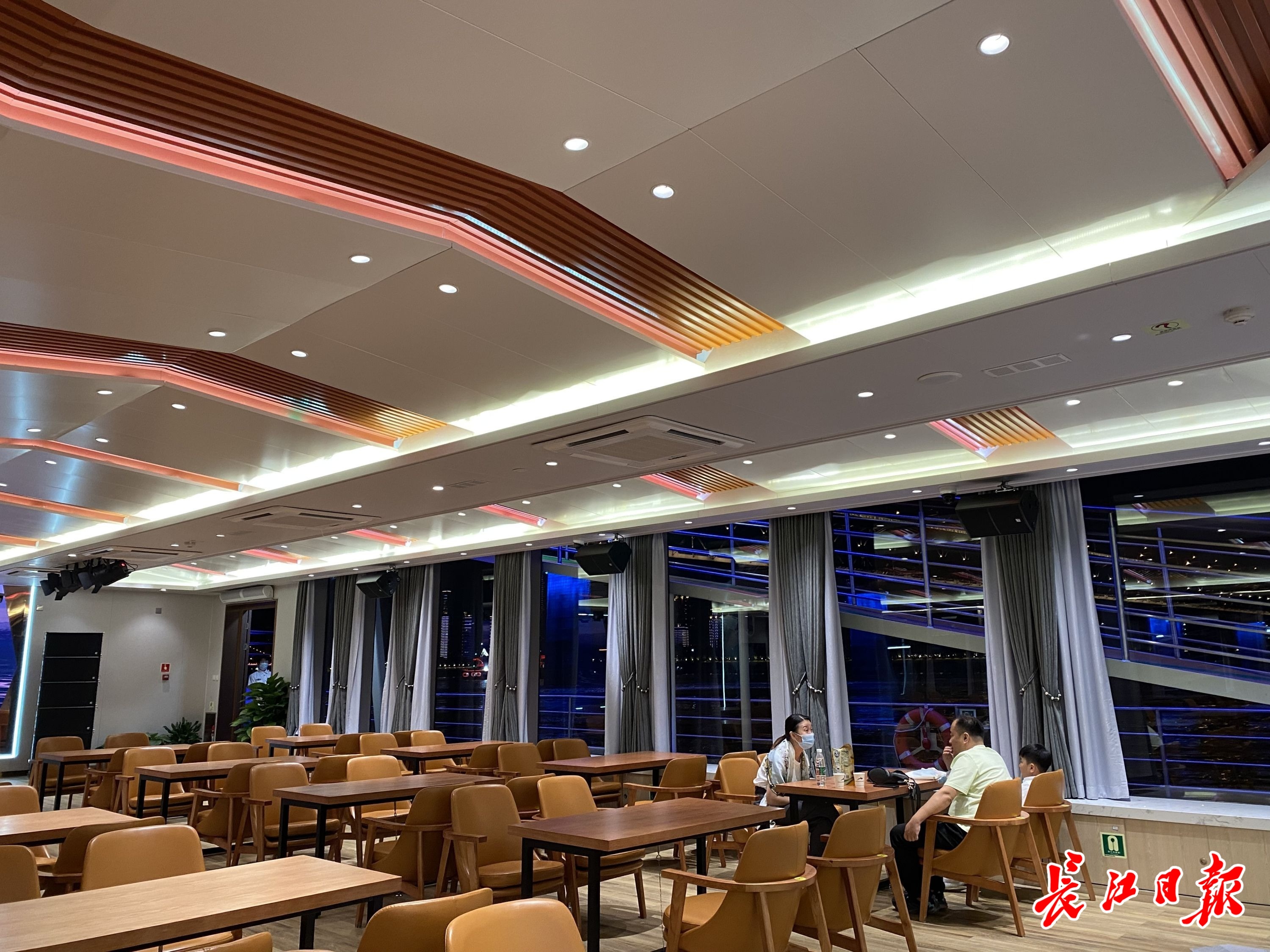 “明显比传统的柴油动力游船安静和平稳,在船上几乎感受不到颠簸和噪声。”游客李灿发现了“两江晴川”号带来的不同乘坐体验,“新船很宽敞,颇具豪华感和舒适性,颜值也高。”市民汪女士带着孩子坐在三楼甲板座椅上看江景,不时以沿岸灯光秀和地标建筑为背景拍照留念。她说:“在家门口的游船上夜间休闲很惬意,船上在播放着导览讲解词,孩子在游玩的同时还能进一步了解城市文化。”