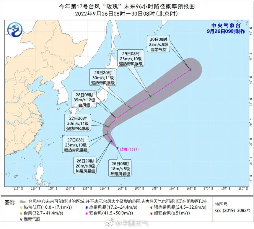 据@中国天气,今年第17号台风“玫瑰”(台风级)已生成,今天(29日)早晨5时中心位于日本东京偏东方向约1350公里的西北太平洋洋面上,预计,“玫瑰”将以每小时65公里左右的速度向东北方向快速移动,强度变化不大。29日夜间开始逐渐变性为温带气旋。未来“玫瑰”对我国海域无影响。