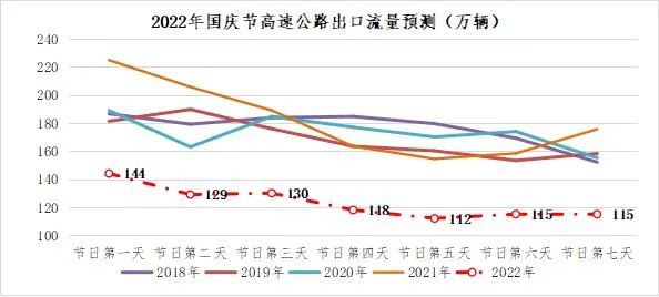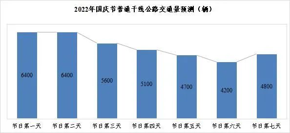 目前我省疫情防控平稳有序,预计今年国庆节全省高速路网出口流量将较平日小幅增加。预计长假7天出口总车流量将达到863万辆,日均123万辆,是平日流量的1.2倍,较2021年国庆节下降32%,较2020年国庆节下降29%,路网交通量预计日均为3.3万辆,是平日的3倍,较2021年国庆节下降3%。普通干线公路网日均交通量约为5314辆,是平日交通量的1.05倍,较2021年国庆节交通量基本持平。