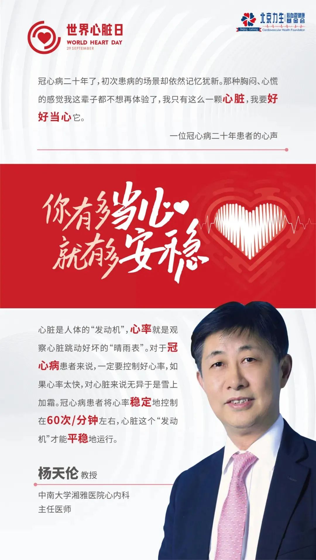中南大学湘雅医院心内科主任医师杨天伦教授介绍道:“心率增快是冠心病的重要危险因素,也是冠心病患者的独立预测因素。对于患有心血管疾病的患者而言,要将心率长期稳定在60-80次/分钟是比较合适的水平,但冠心病患者最好将休息状态下的心率控制在50-60次/分钟。心率控制在此范围,有助于降低心肌耗氧量,改善心肌缺血,稳定动脉粥样硬化斑块。同时冠心病患者一定要注意不能过度劳累,避免引发交感神经过度激活导致的心慌、胸闷。”