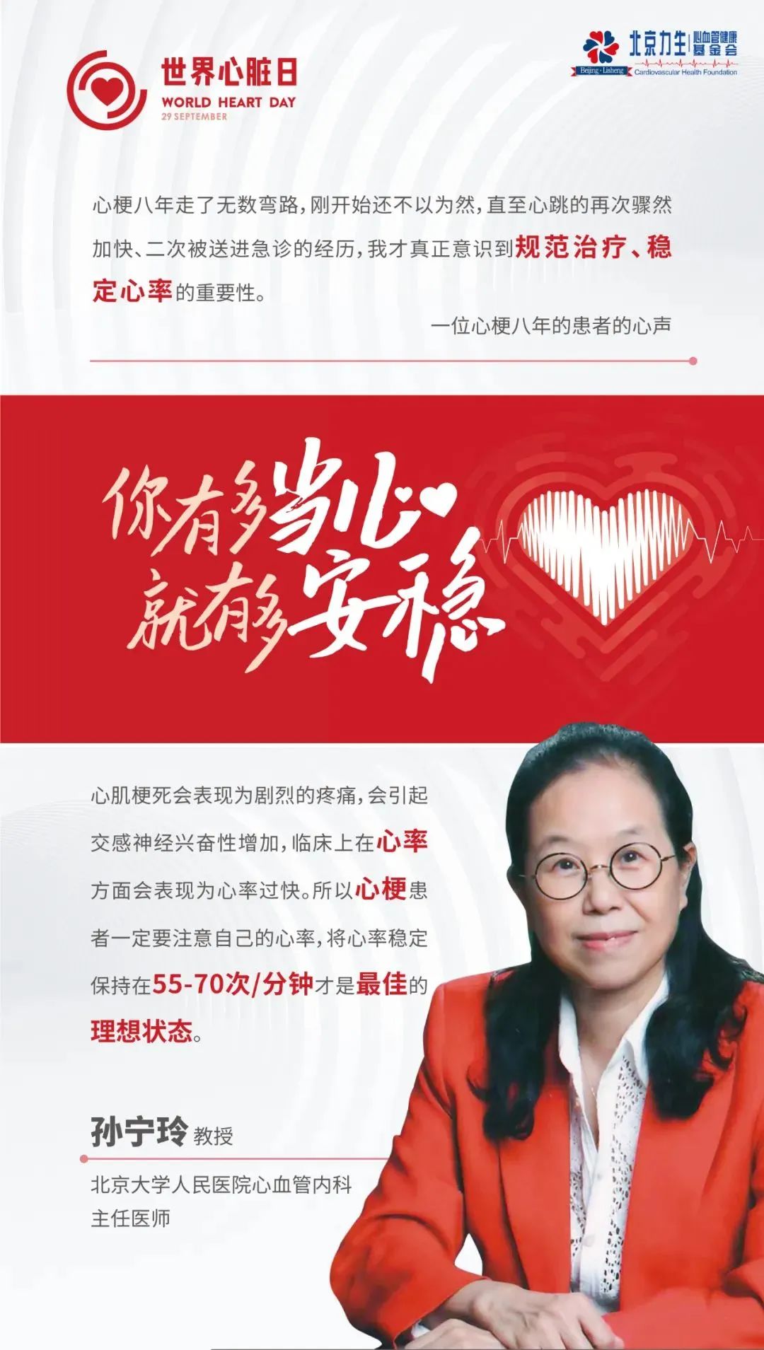 北京大学人民医院心血管内科主任医师孙宁玲教授介绍道:“急性心肌梗死是冠状动脉急性、持续性缺血缺氧所引起的心肌坏死。心肌梗死的患者有心率增快的症状是一个不好的现象,我们要及时干预心率过快的情况,以保证心肌有效的血氧供应。最适合的心率应该保持在55-70次/分钟。心梗患者会比较关注自己的血脂和血压,而忽视对心率的关注,日常生活中长期熬夜,喝酒,吸烟等都会导致心率过快,所以对于有心梗的患者来说,一定要保持良好的生活习惯,同时要规律服用稳定心率的药物。