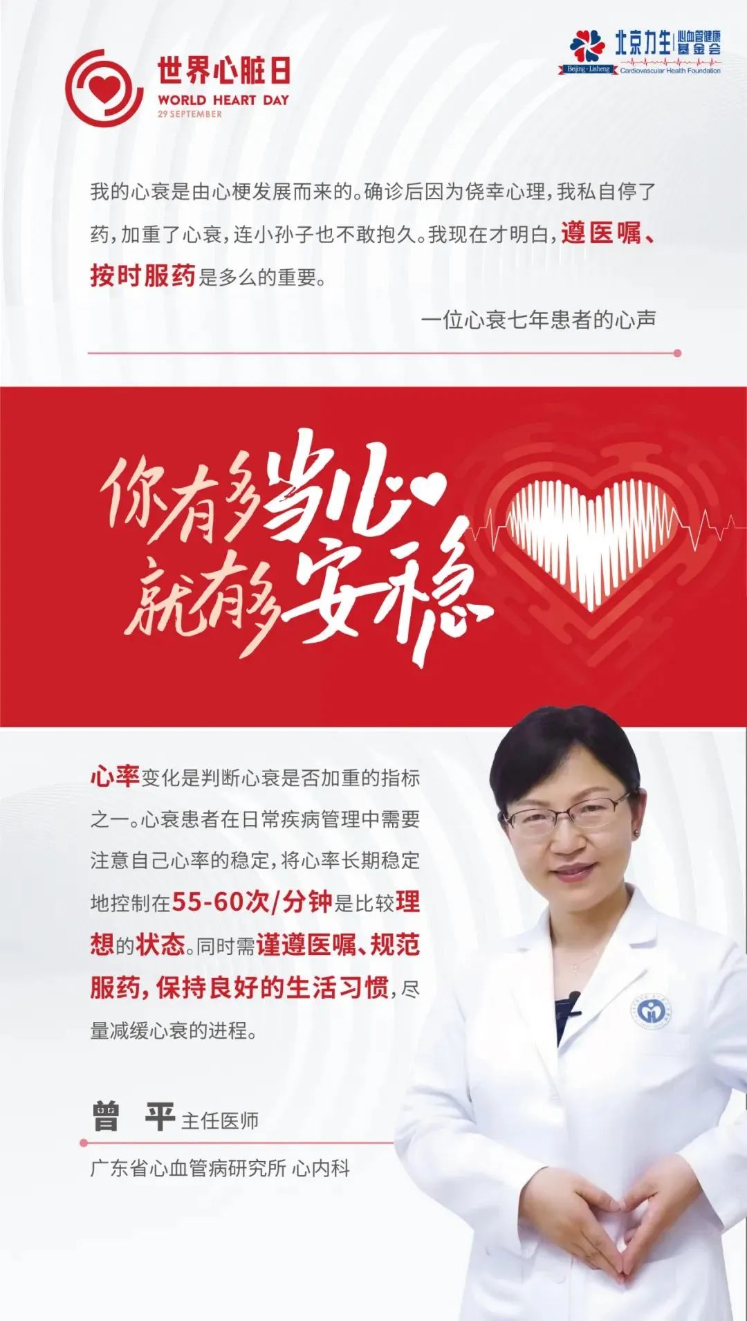 广东省心血管病研究所心内科主任医师曾平介绍道:“慢性心力衰竭是各种病因所致心脏疾病的终末阶段,是一种复杂的临床综合征。心率变化是监测心衰患者病情的“晴雨表”,也是判断心衰是否加重的指标之一。因为心衰的进展与神经内分泌过度激活密切相关,而交感神经过度激活可导致心率增快,诱发心衰,此外,心率的加快也会增加心血管死亡和再住院的风险。因此,有效控制心率对心衰患者至关重要。心衰患者的心率管理任何时候都不算早,应贯穿在心衰治疗全过程,将心率长期稳定控制在55-60次/分钟才是正常的范围。此外,心衰患者在日常的疾病管理中,一定要在家里备足药物,注意按医嘱服药,不可怀有侥幸心理,随意减停药物。“