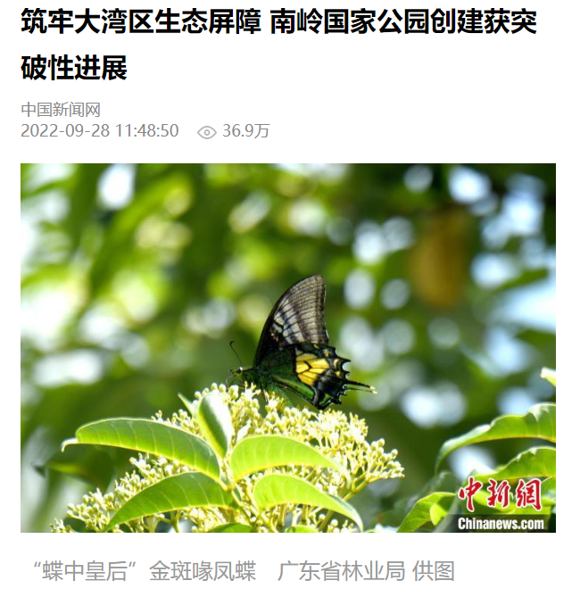 广东省自然资源厅、广东省林业局有关负责人指出,在这里,金斑喙凤蝶可以肆意生活生长,觅食着特定的植物种类,找到充足的食物供应。
