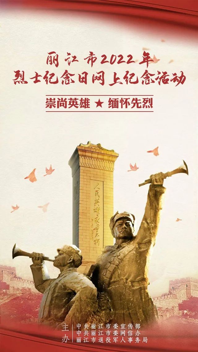 今年9月30日是第九个“烈士纪念日”。在“烈士纪念日”来临之际,由中共丽江市委宣传部、丽江市委网信办、丽江市退役军人事务局共同举办丽江市2022年烈士纪念日网上纪念活动,通过网上祭扫的方式,让我们铭记历史,向先烈表达自己最崇高的敬意!