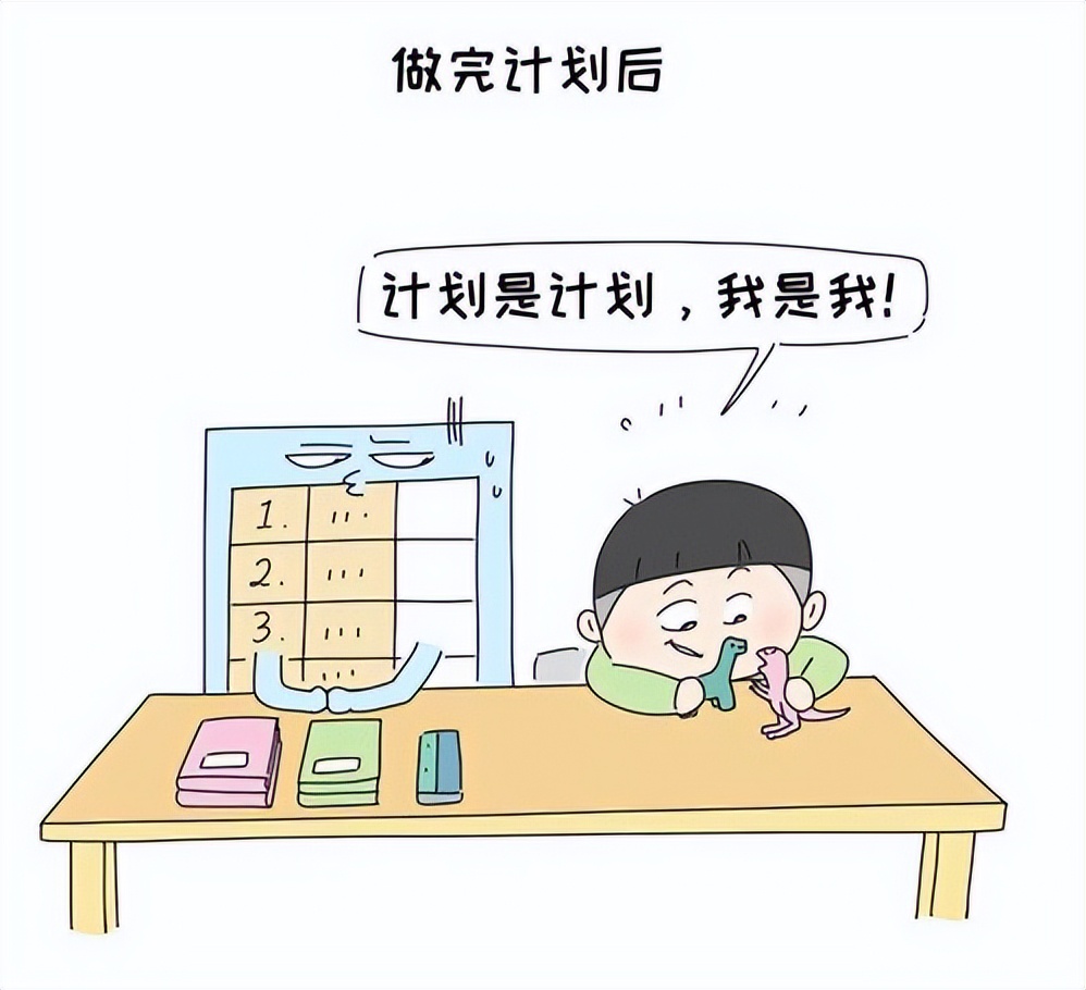 好了,这个时候很可能会出现“道德许可效应”。孩子定好了计划,打算明天开始认真执行。为什么呢?因为今天制定了这么详细的计划,他自我感觉已经很良好了。