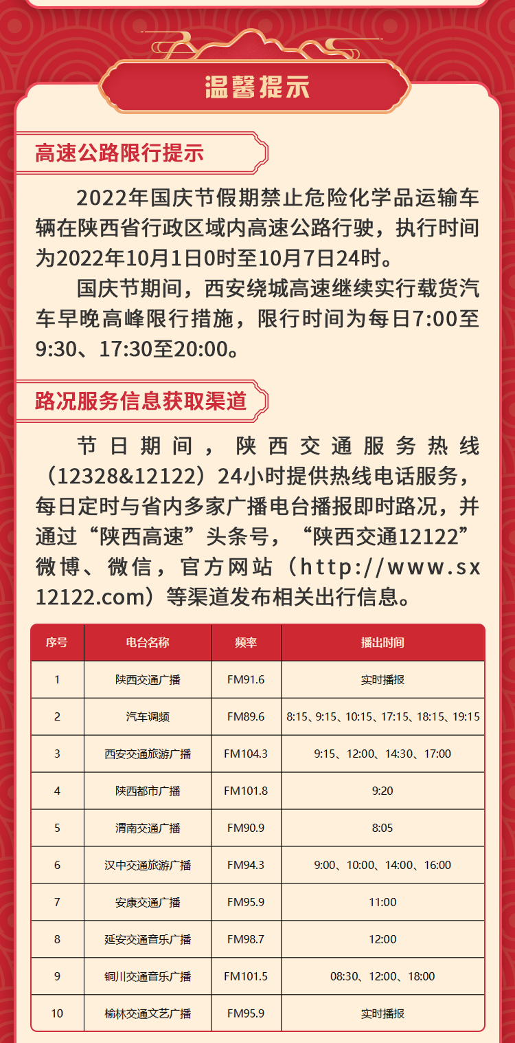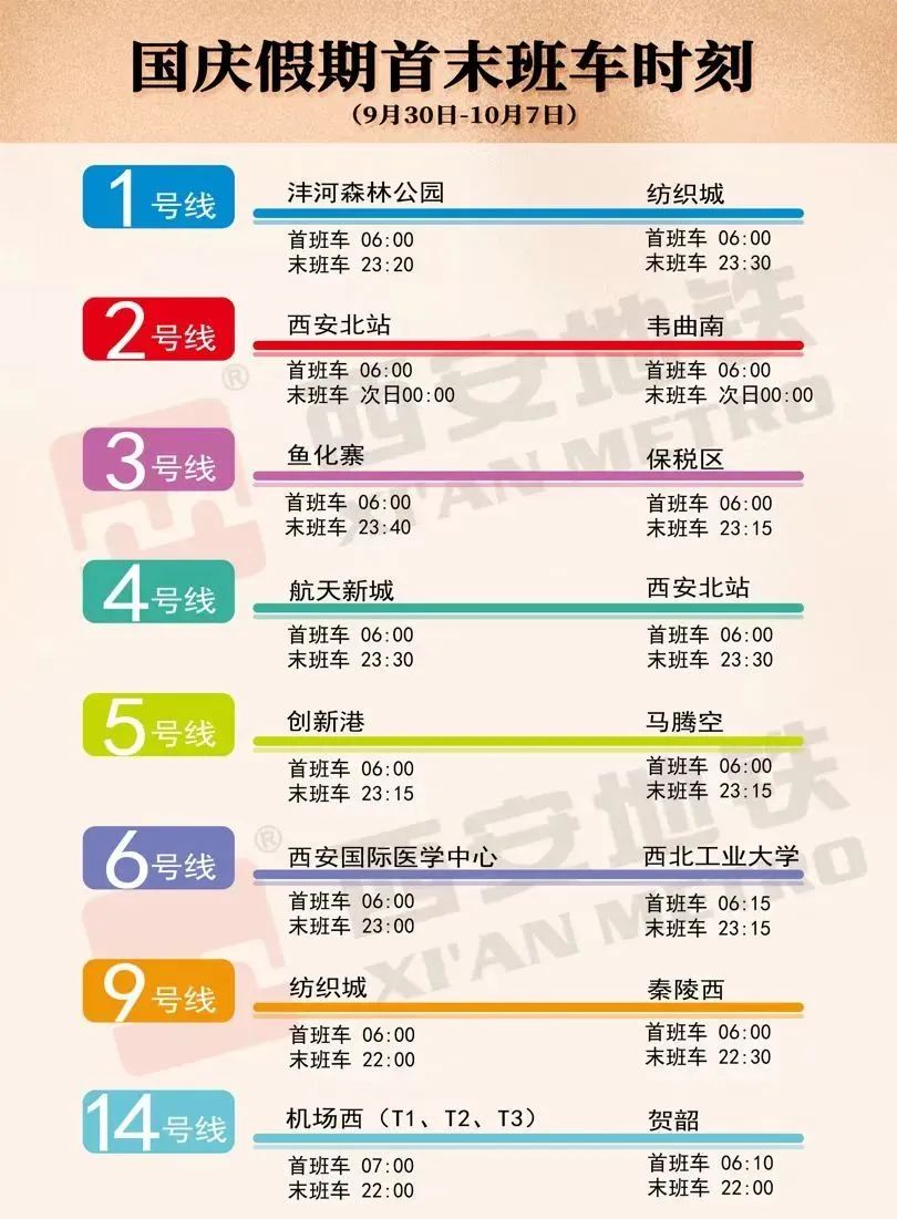为保障节日乘客夜间出行需求,9月30日至10月7日期间,西安地铁还将对3号线末班车发车时间进行调整。地铁3号线鱼化寨站末班车发车时间由23:15延长至23:40,保税区站末班车发车时间由23:00延长至23:15。另外,西安地铁也将进一步加强线路客流监测,并通过加开备用列车、适时启动客流控制等措施,为乘客提供安全舒适的出行体验。