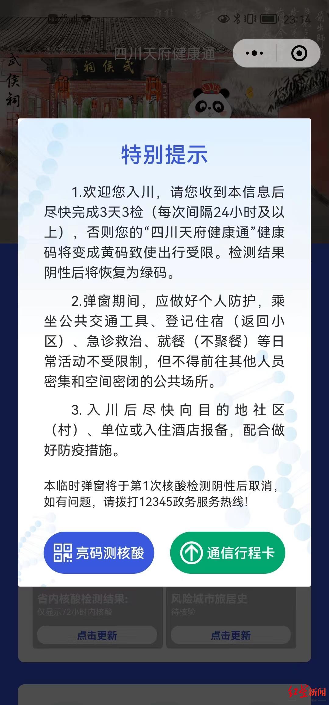 1.来(返)川人员收到临时弹窗提示后,请尽快完成3天3检(每次间隔24小时及以上),否则“四川天府健康通”健康码将变成黄码,致使出行受限。检测结果阴性后将恢复为绿码。