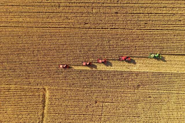 ↑ 在吉林省四平市梨树县国家百万亩绿色食品原料(玉米)标准化生产基地核心示范区,农民驾驶农机进行秋收作业。