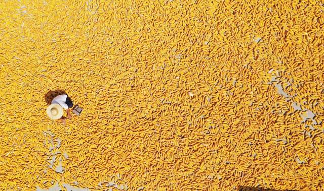 ↑ 在山东省临沂市郯城县郯城街道,农民晾晒收获的玉米。