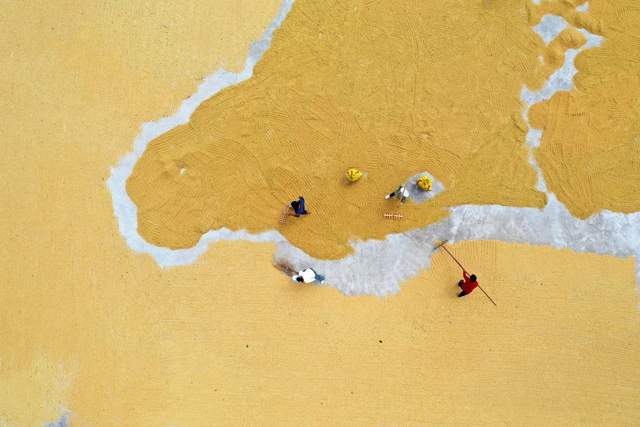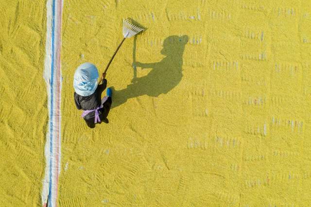 ↑ 村民在贵州省黔东南苗族侗族自治州从江县高增乡小黄侗寨晾晒稻谷。