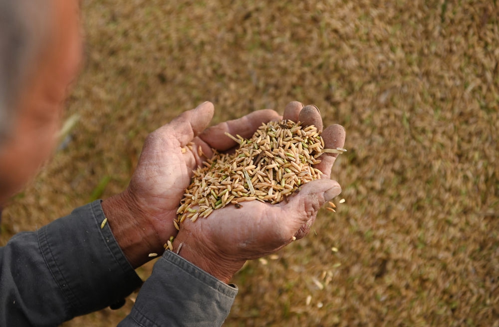 ↑ 汉中市汉台区武乡镇的农民查看收割机卸下的稻子。