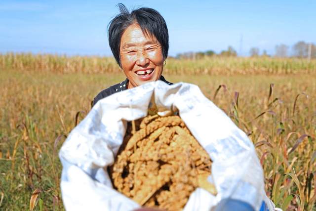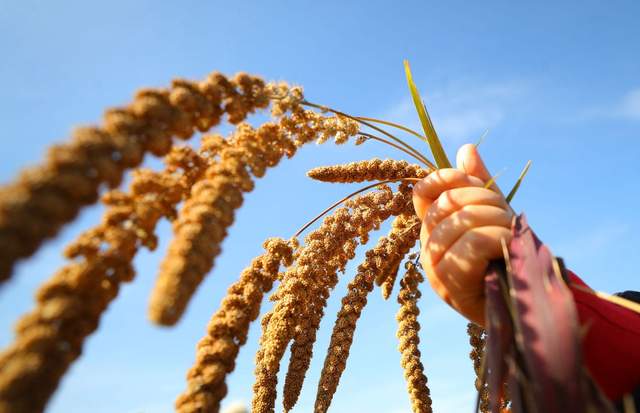 ↑ 在康平县方家屯镇东小陵村,农民展示收割的谷穗。