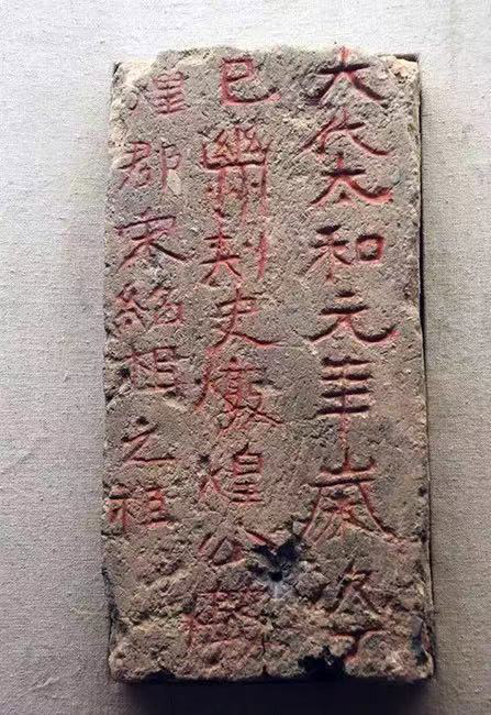 宋绍祖墓中出土了一块暗灰色墓铭砖,形状与普通墓砖相同,无特殊雕饰,其上阴刻着一段文字,共3行25字,字上涂有朱色。文字为:“大代太和元年岁次丁巳幽州刺史敦煌公敦煌郡宋绍祖之柩”。