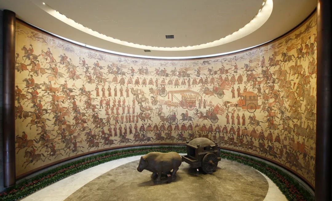一层共享大厅宋绍祖墓牛车主题雕塑吸引游客驻足欣赏。