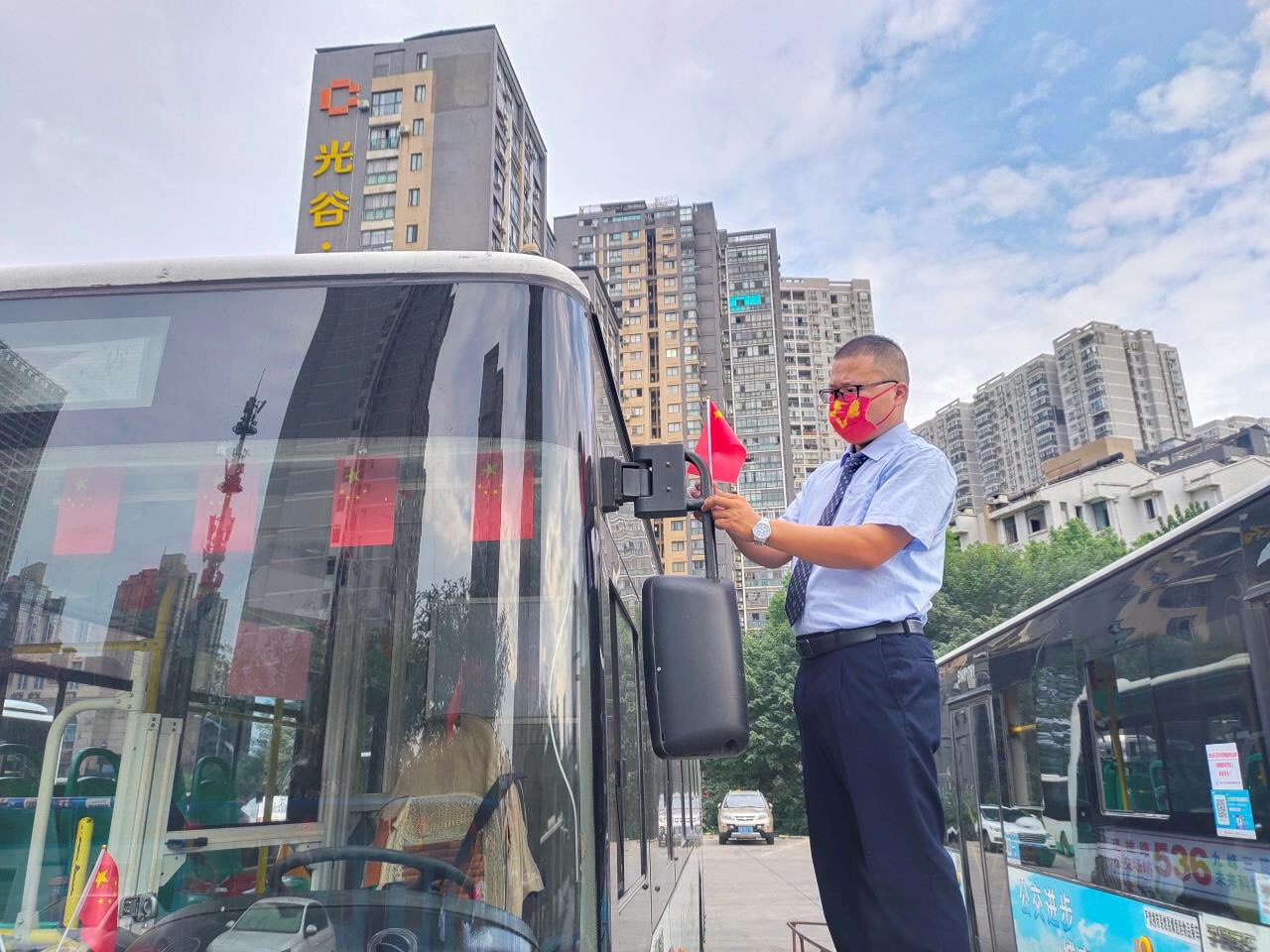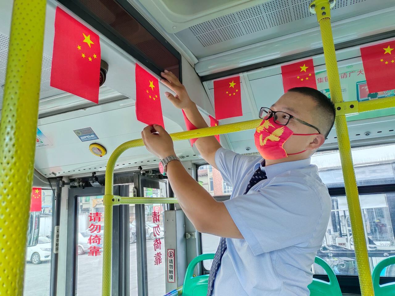 一走进公交车厢,两侧悬挂的国旗让人感受到了浓浓的节日氛围。9月29日,国庆节前夕,武汉公交788路驾驶员钱锴锦用国旗装扮车厢,戴上了红色的口罩,以这样的方式向祖国真情告白。