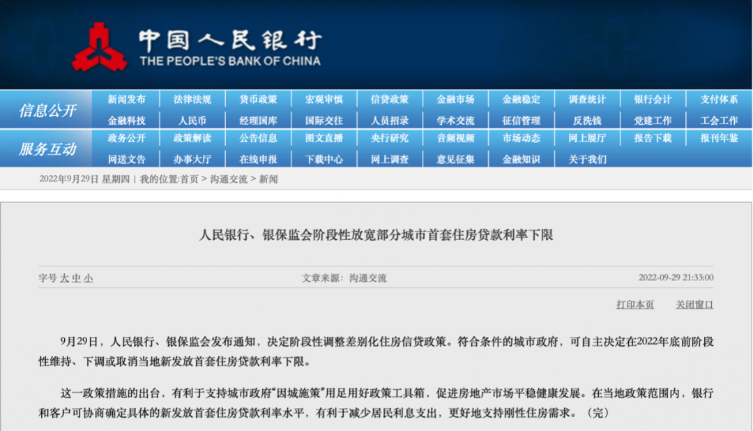 据中国人民银行官网消息,9月29日,人民银行、银保监会发布通知,决定阶段性调整差别化住房信贷政策。符合条件的城市政府,可自主决定在2022年底前阶段性维持、下调或取消当地新发放首套住房贷款利率下限。