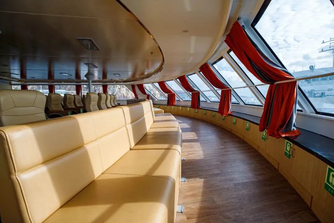 客船内部共四层,船舱内设咖啡厅和茶吧,上舱和观光舱座椅全部为皮质沙发,沙发中间增设了置物架;座位之间间距宽敞,也方便乘客摆放物品;船舱内还设置了5个包厢。以上配置能使游客在饱览海上风光的同时,更好地享受舒适的海上之旅,同时提升嵊泗旅游形象。