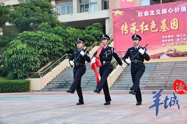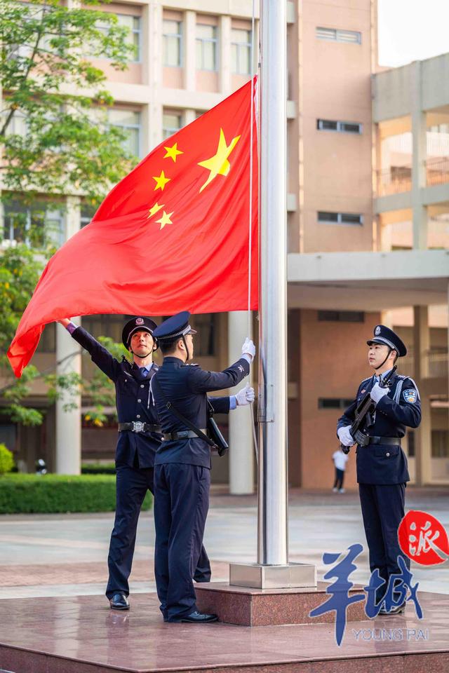 当天上午6时30分,在指挥员“出旗”口令下,阳江边检站国旗护卫队3名成员神情肃穆、精神抖擞,迈着坚定有力的步伐护卫国旗走向国旗台,全体人员整齐列队,立正注目。