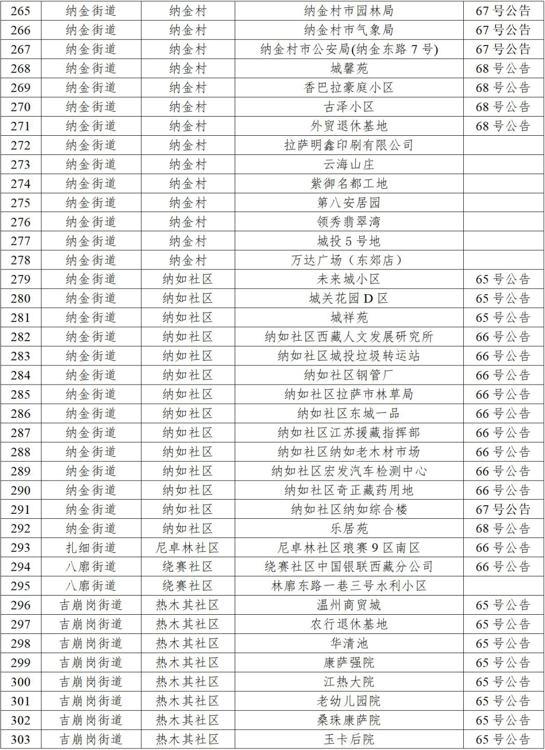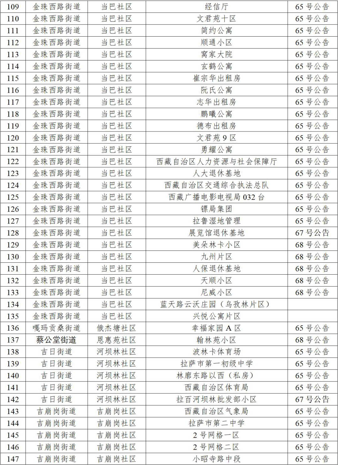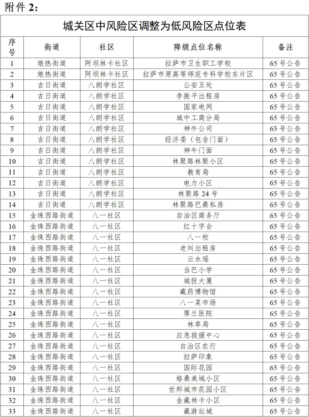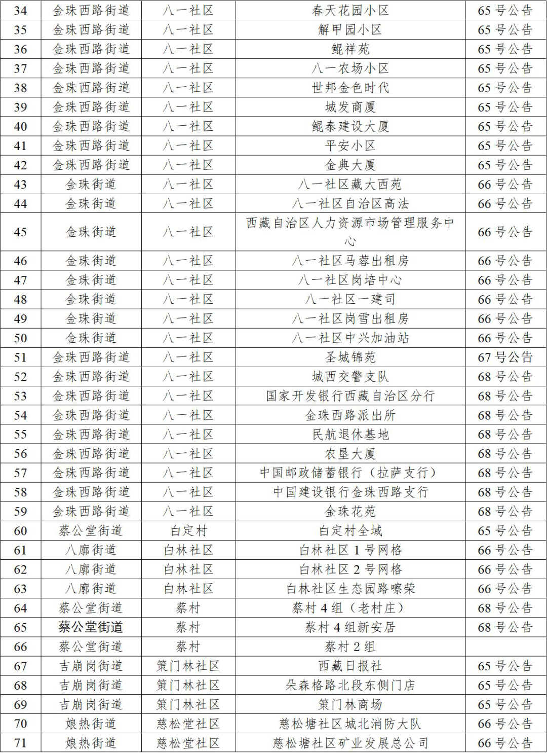 9月29日全市高风险区调整为2个,中风险区调整为47个。截至9月30日0时,堆龙德庆区(不含柳梧新区)高中风险区全部解除。具体为: