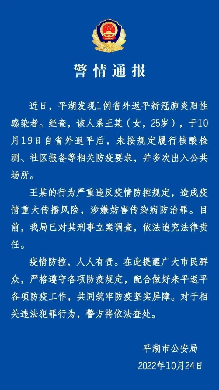 10月24日,平湖市新增2例新冠肺炎阳性感染者,为集中隔离点检出,系我市本轮疫情首例阳性感染者的密切接触者,均已闭环转运至定点医院隔离治疗,现将两人主要活动轨迹通报如下: