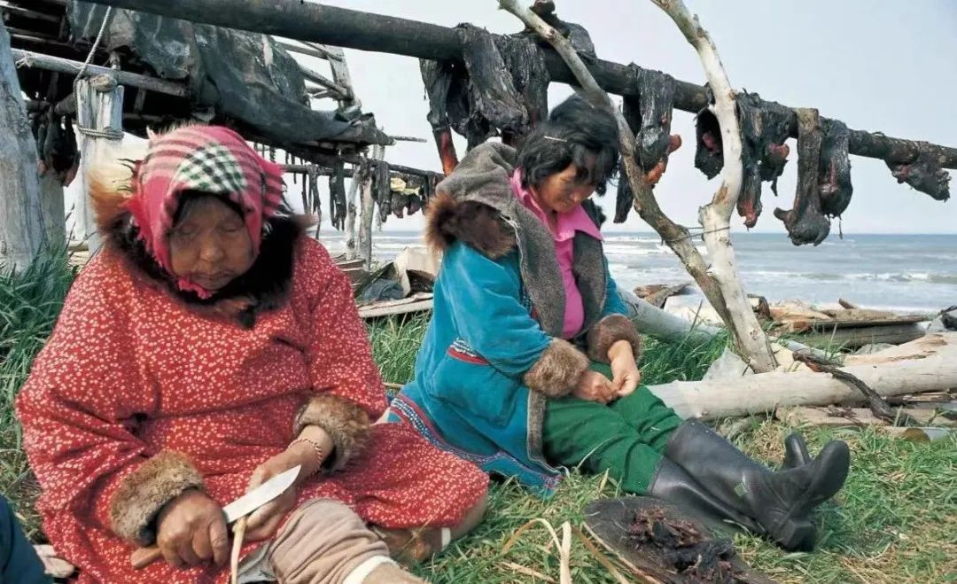上:妇女们在海边肢解海豹,将海豹肉晒成肉干