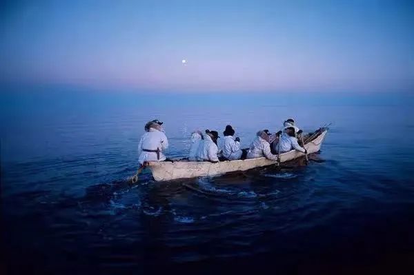 下:满月的夜晚,乘坐传统捕鲸用的木架皮舟,在冰海上寻找鲸鱼踪影。皮舟是用髯海豹的皮制成。