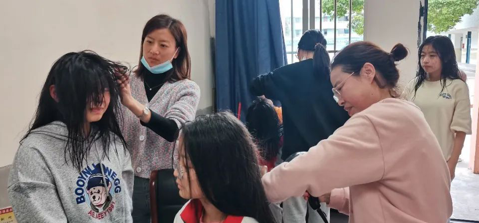女孩子坐在椅上满脸幸福,女老师站在身旁满眼慈爱,电吹风送出温暖,好一幅母女温情图。