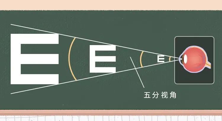 看整个字母“E“”,因为是5个小份整体看,所以与眼睛的夹角就是5分视角。