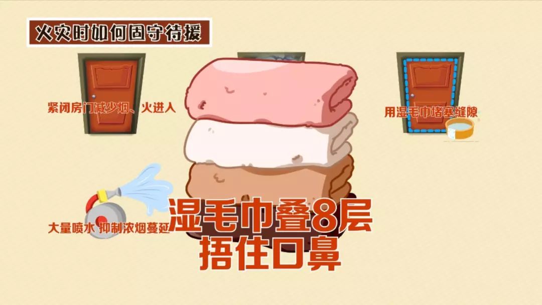 将毛巾彻底浸湿,拧至半干叠成8层,捂住口鼻;