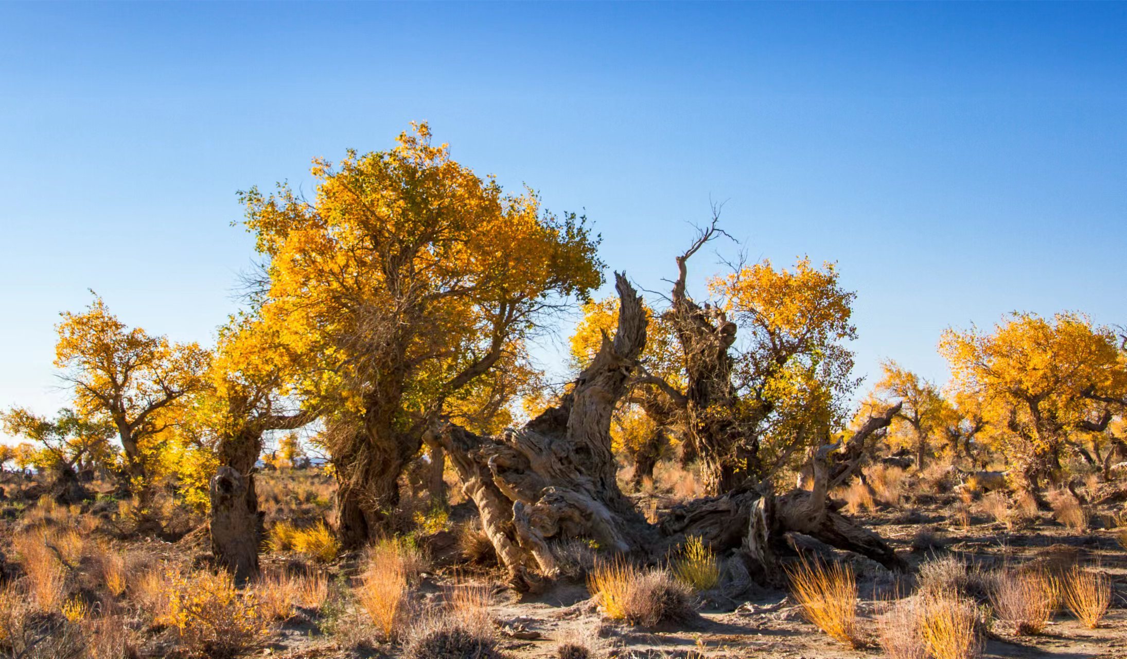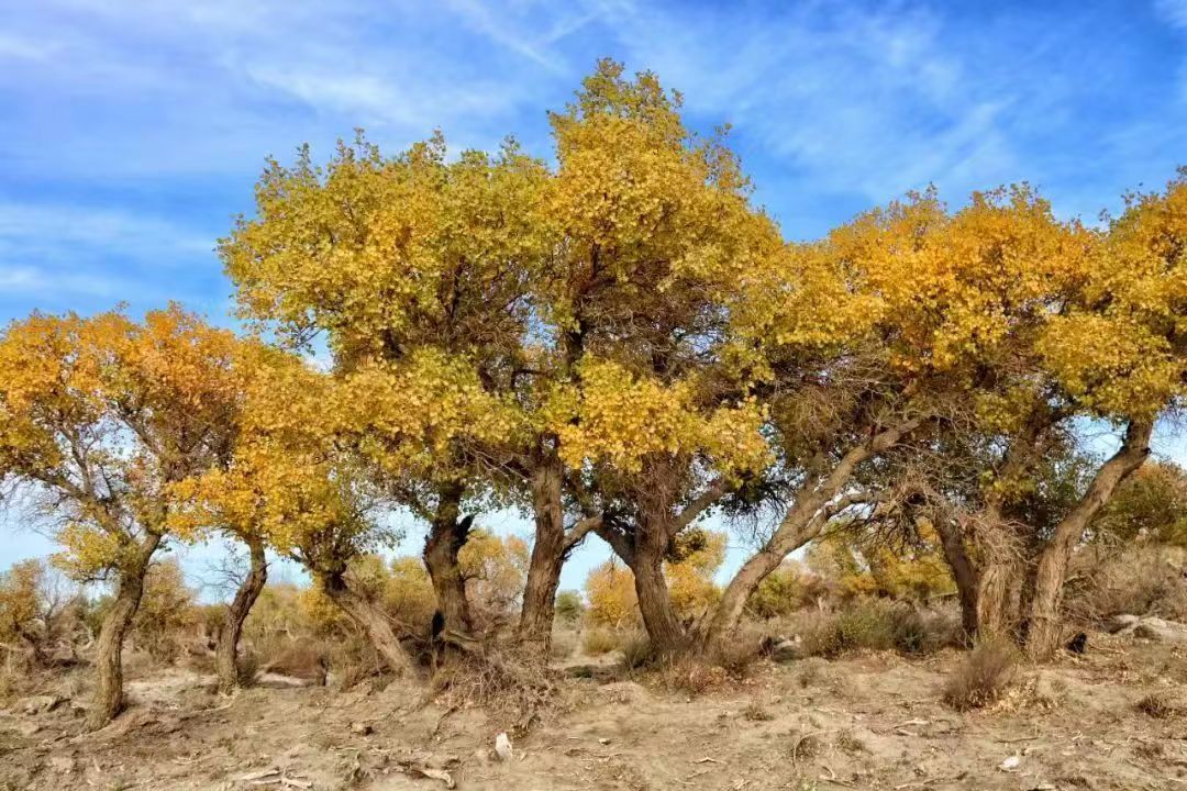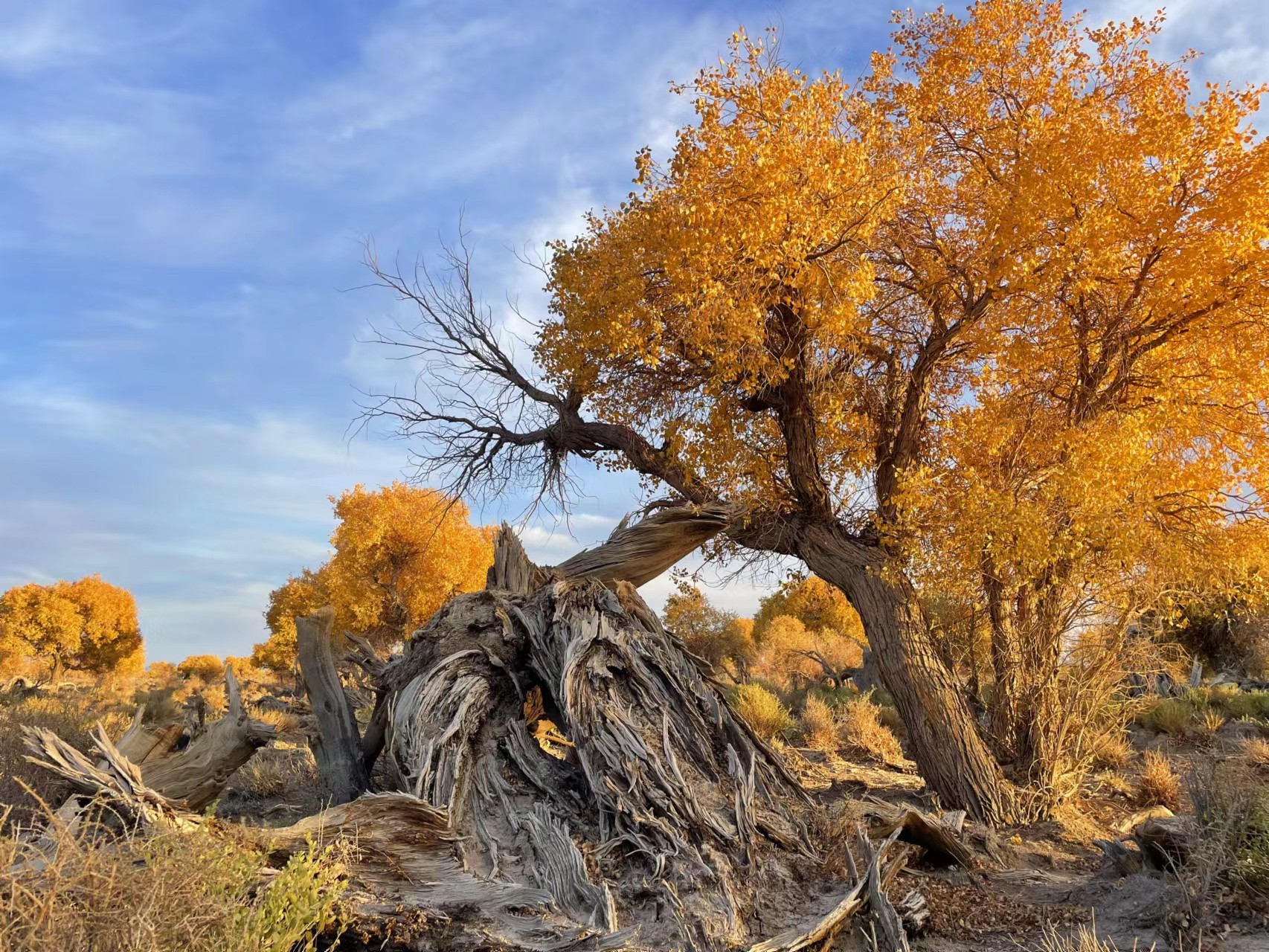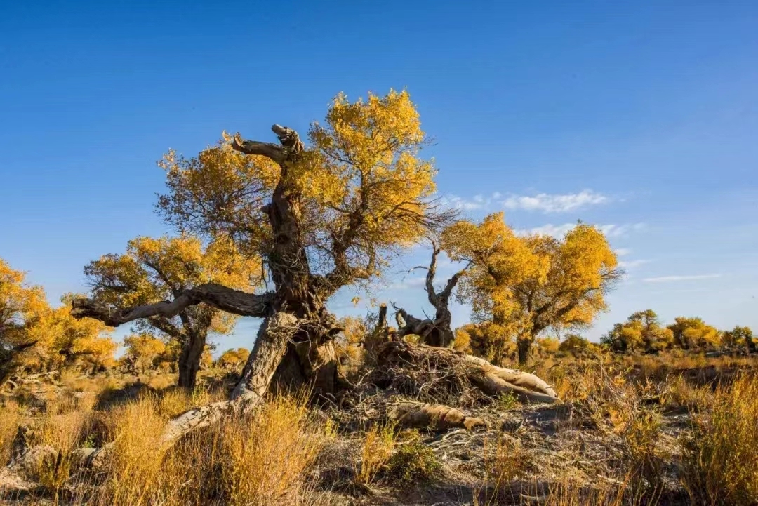 金秋十月,新疆伊吾47.6万亩胡杨迎来最美季节,胡杨鬼斧神工般的形态,向人们展示大自然的壮美,金色胡杨在阳光的照耀下与蓝天、白云、戈壁相映成趣,构成了一幅绚丽多彩的画卷。
