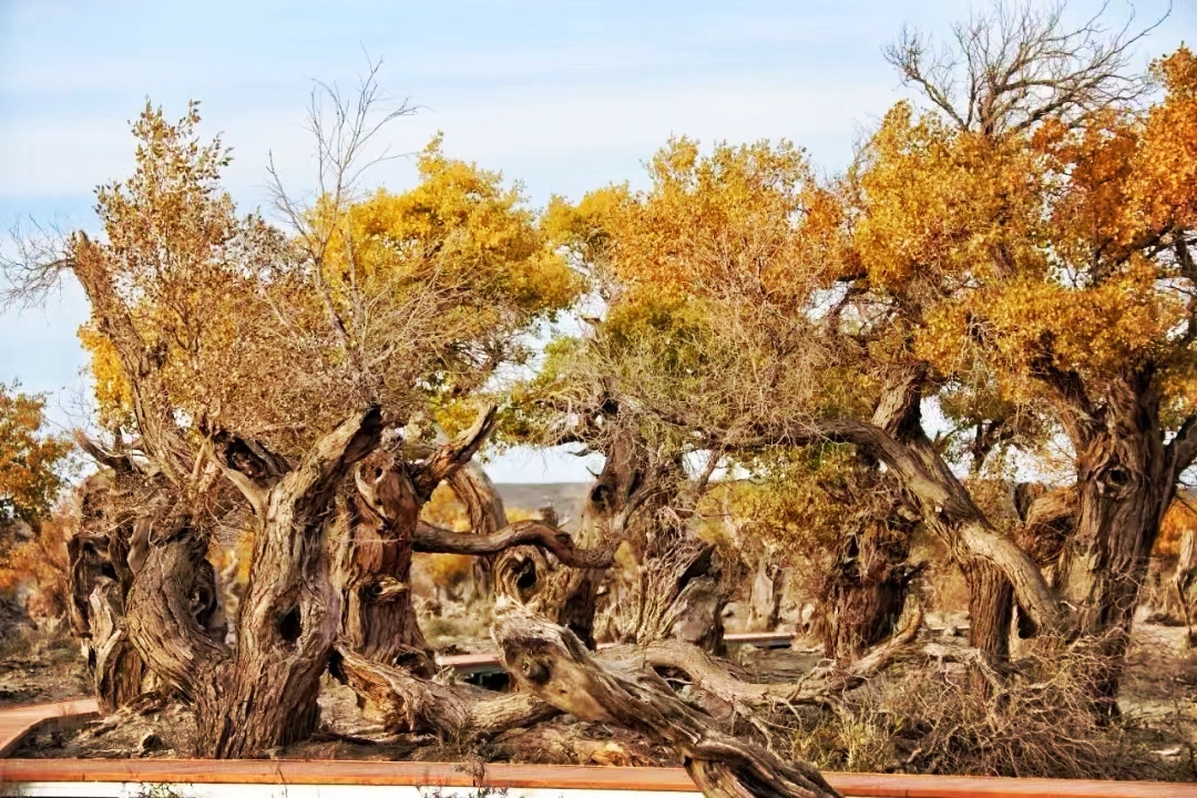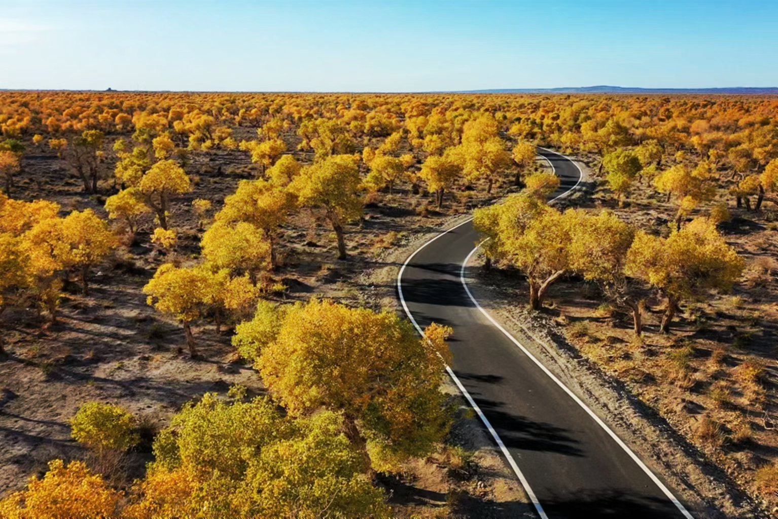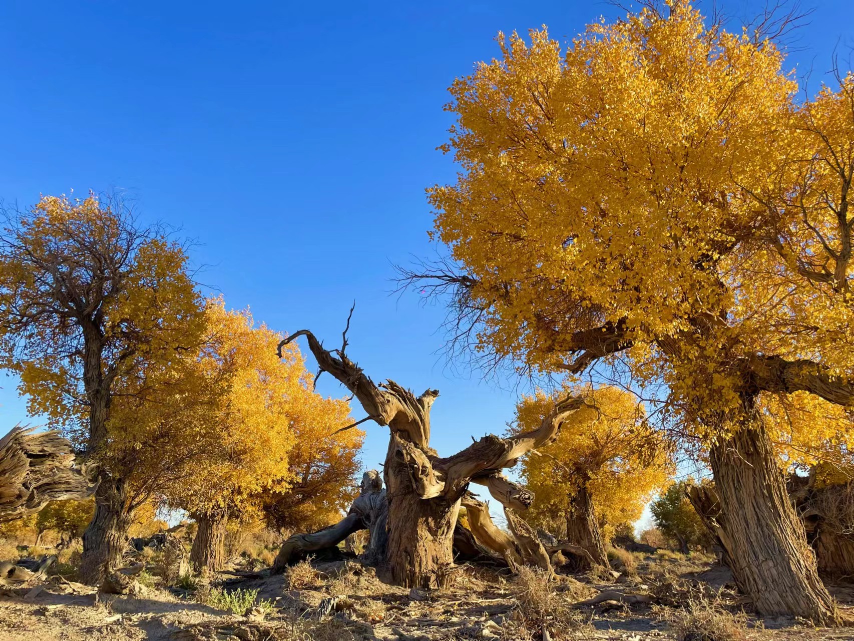 金秋十月,新疆伊吾47.6万亩胡杨迎来最美季节,胡杨鬼斧神工般的形态,向人们展示大自然的壮美,金色胡杨在阳光的照耀下与蓝天、白云、戈壁相映成趣,构成了一幅绚丽多彩的画卷。