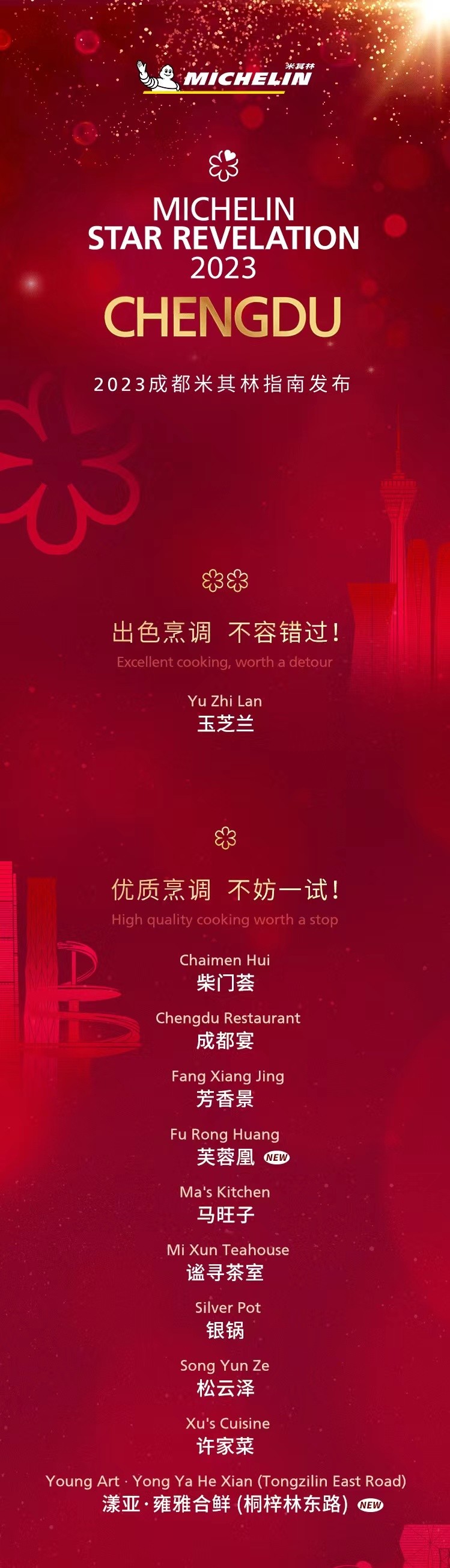 有句俗语叫“食在中国,味在四川”,作为美食之都的成都,遍布大街小巷的特色餐馆究竟哪一些能够击中食客的味蕾,让人大快朵颐。10月25日,米其林发布了2023年度的成都米其林指南完整榜单,包括1家二星餐厅、10家一星餐厅和15家必比登推介餐厅、31家米其林指南入选餐厅,此外,还包括“米其林服务奖”和中国内地首个全新奖项“米其林侍酒师奖”。