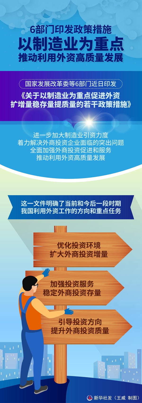 新华社北京10月25日电(记者安蓓)记者25日了解到,国家发展改革委等6部门近日印发《关于以制造业为重点促进外资扩增量稳存量提质量的若干政策措施》,进一步加大制造业引资力度,着力解决外商投资企业面临的突出问题,全面加强外商投资促进和服务,推动利用外资高质量发展。
