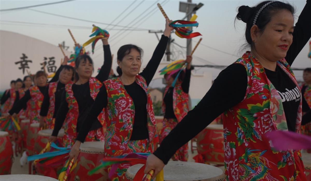 景湾社区的鼓型舞台上,威风锣鼓队队员们精气神十足。(视界网 江车 摄)