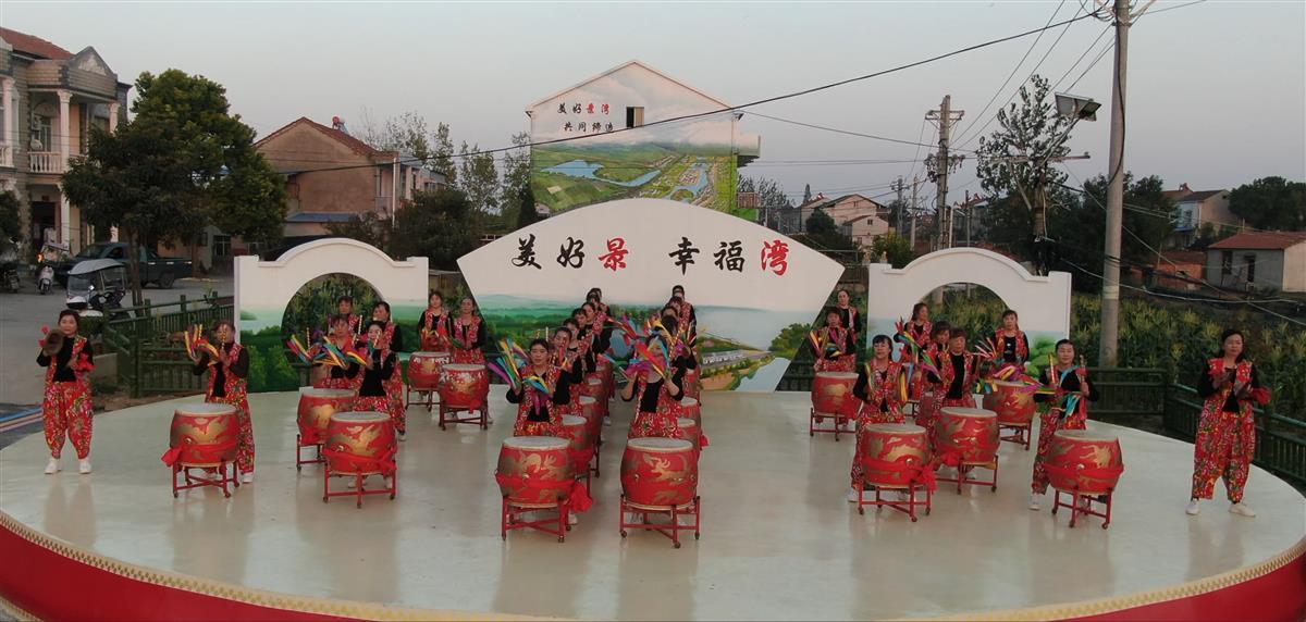 10月20日晚7点许,汉川市华严农场景湾社区广场,威风锣鼓队队长朱杏芳忙着把锣鼓搬上舞台。