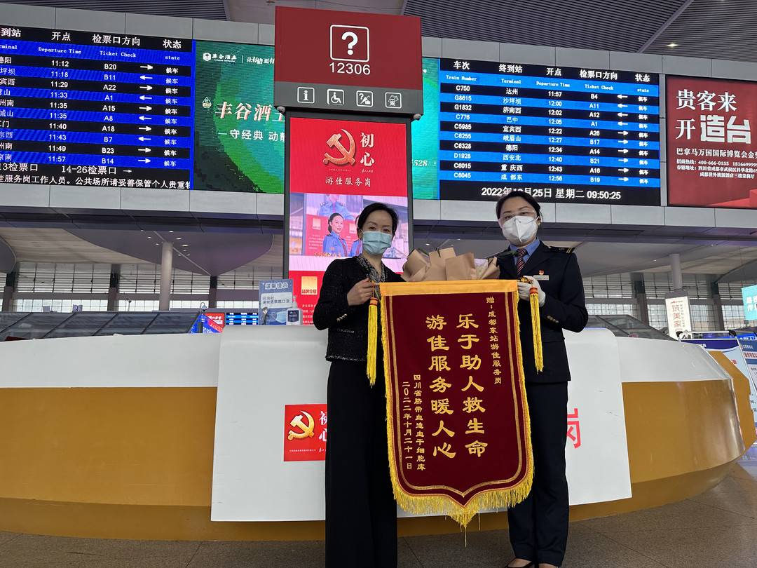 10月25日上午,四川省脐带血造血干细胞库(以下简称四川脐血库)工作人员张琴,来到成都东站“游佳服务岗”,将有一面锦旗赠送到成都车站东客运车间副主任游佳的手中,感谢他们在疫情期间开辟的“绿色通道”,为江苏白血病患儿送去救命用的脐带血造血干细胞。