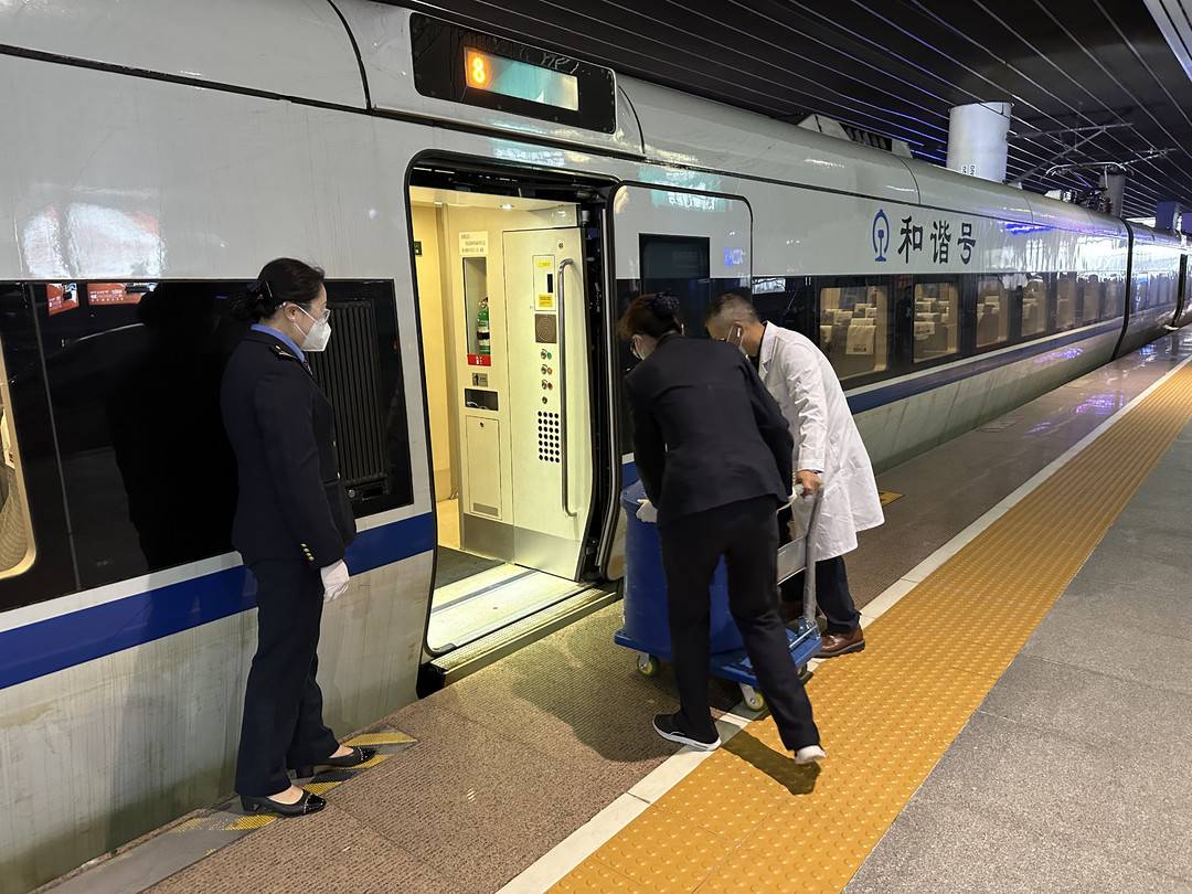 10时48分,G1976次列车准时到达成都东站10站台,车站工作人员迅速将脐带血液氮转运罐及相关资料交到列车工作人员手中,在与列车长办理完交接手续后,11时01分“救命血”搭乘高铁向南京南站驶去。