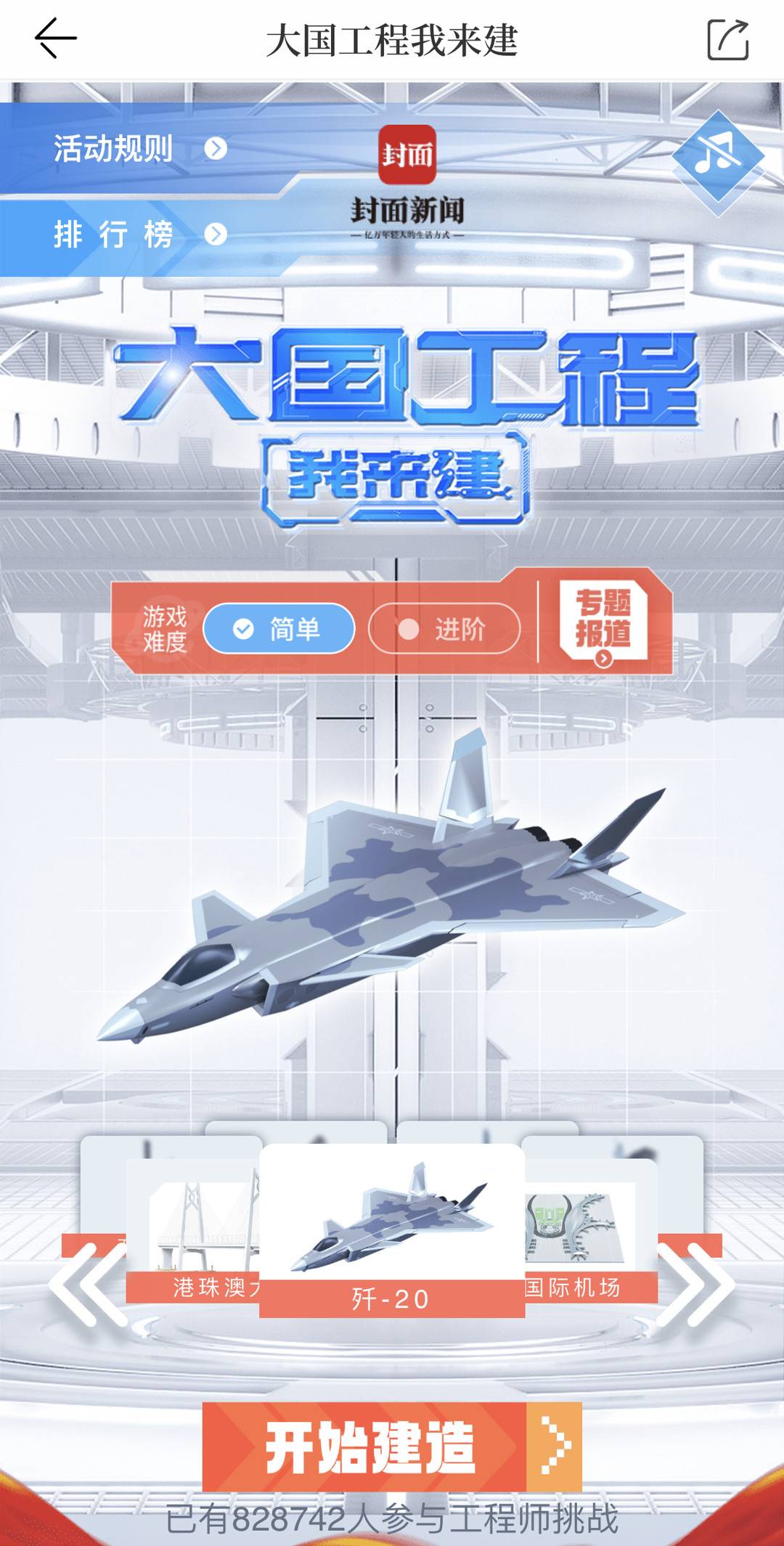 解锁“工程师”称号,用实际行动向大国工程助力。10月13日,由封面新闻出品的“大国工程我来建”3D互动游戏正式上线。截至10月25日16:00,参与游戏的人数达到828742人。